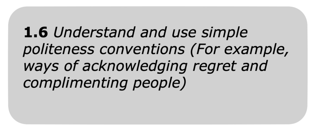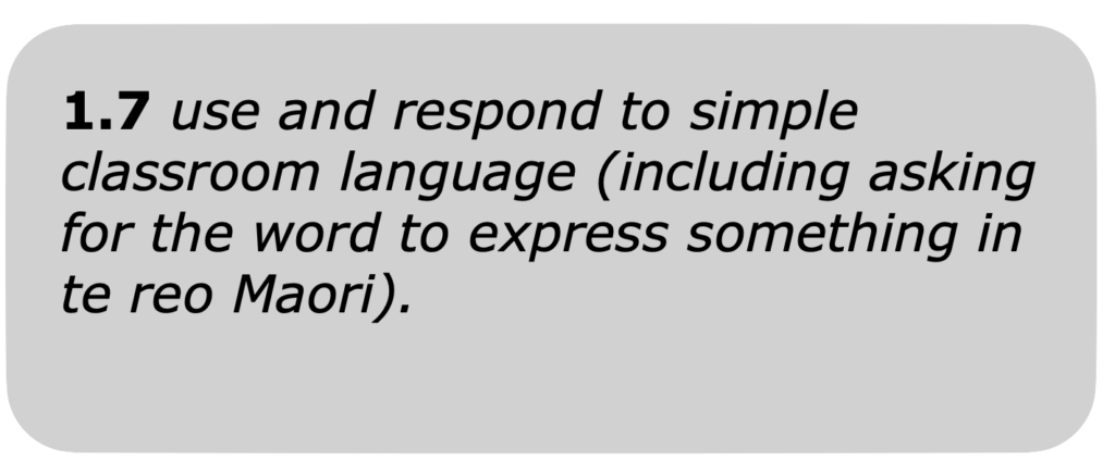 Te Reo Achievement Objective Level 1 Coming Soon Develop Vocab Pronunciation 1.1 Greet, farewell and acknowledge people and respond to greetings and acknowledgments 1.2 Introduce themselves and others and respond to introductions 1.3 communicate about number, using days of the week, months, and dates 1.4 communicate about personal information 1.5 Communicate about location 1.6 Understand and use simple politeness conventions 1.7 Use and respond to simple classroom language Develop Vocab Pronunciation 1.1 Greet, farewell and acknowledge people and respond to greetings and acknowledgments 1.2 Introduce themselves and others and respond to introductions 1.3 communicate about number, using days of the week, months, and dates 1.4 communicate about personal information 1.5 Communicate about location 1.6 Understand and use simple politeness conventions 1.7 Use and respond to simple classroom language
